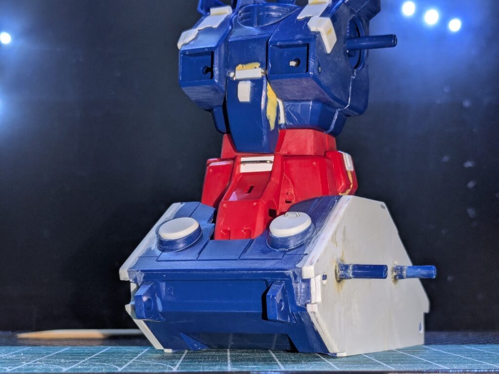 上半身と下半身の接続部の違和感をなくすため、戦車部全体を腰部の高さに合わせて1段下げる加工を実施。